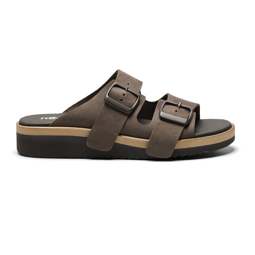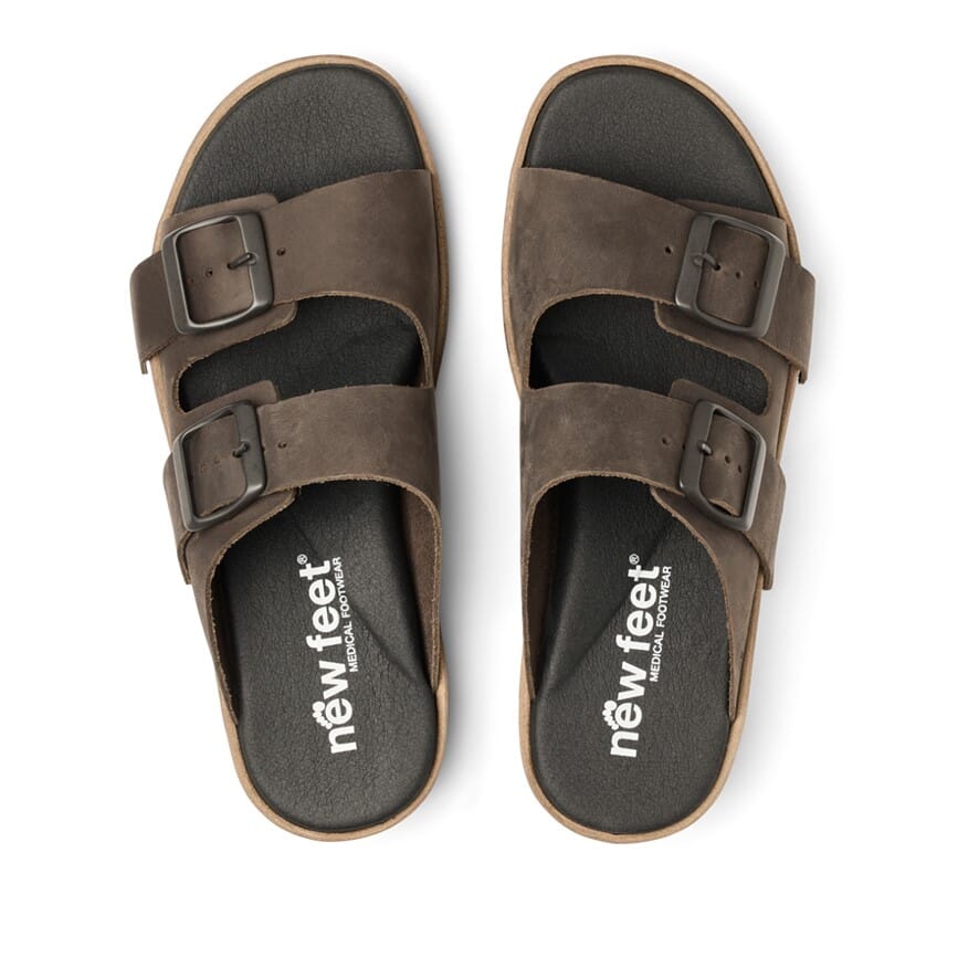 Slippers / Tøffel med to stropper og spenner. Yttersåle i EVA. Oljet skinn. Avtakbar 6 mm støtdempende Protektor® innersåle med buestøtte.