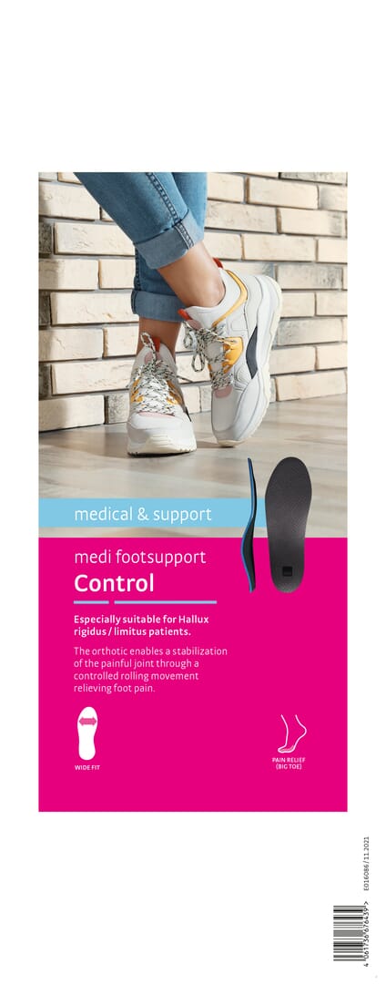 Denne innleggssålen stabiliserer det smertefulle leddet gjennom en kontrollert rullende bevegelse og bidrar til smertelindring. Slim-variant designet for smale sko.